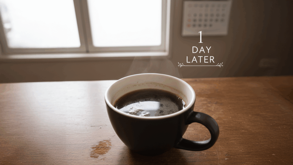 ホットコーヒーをマグカップに入れたまま常温で放置した場合、数時間で風味の劣化がはっきりと感じられるようになります。1日経過したものでは、本来の美味しさはほとんど残っていません。